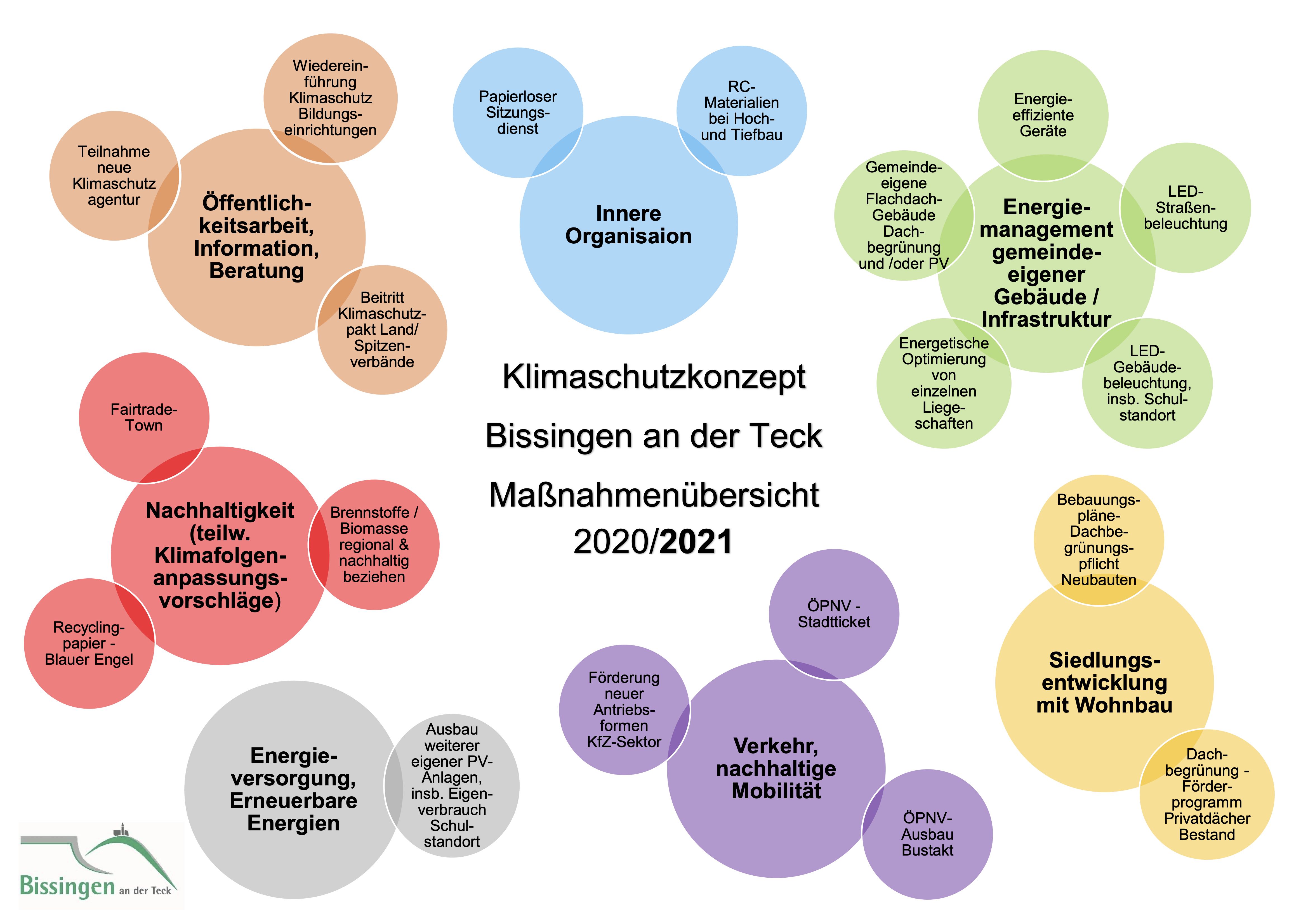 Im Rahmen des integrierten Klimaschutzkonzepts wurden potentielle Handlungsfelder und Maßnahmen für die Gemeinde Bissingen entwickelt. Der Gemeinderat hat diese 2020 verabschiedet und somit eine wichtige Grundlage für zukünftige Entscheidungen gelegt.